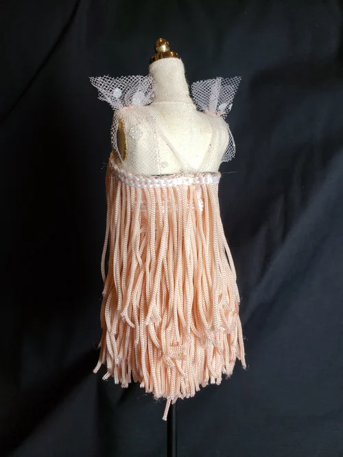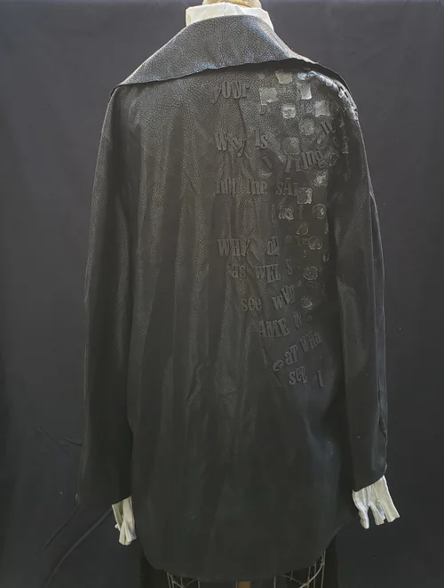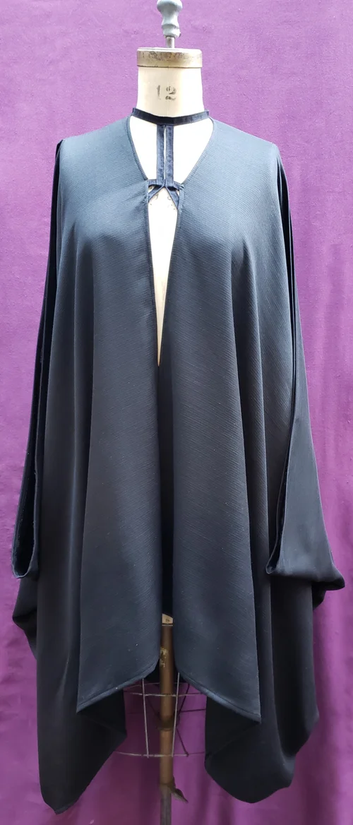 Black wool cape with faux suede trimming, suede cord, and textured plastic button made in 2021.