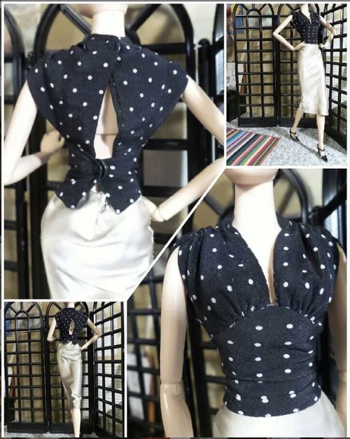 Black coat, pants, and vest. White textured cotton dickey shirt and black with white polka dots cotton bow.